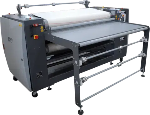 The Practix OK-16 CP Rotary Sublimation Press is available in 104” and 128” wide printable widths. The 16’ diameter oil filled steel encased drum offers 240 degrees of heat contact required for the sublimation heat transfer process. This drum size equates to an increased production speed of 230 feet per hour when running at a 40 second dwell time. Dwell time can easily be increased or decreased to accommodate the substrates heat transfer needs. Changing of the setting is easily performed on the large touch screen pad, and all settings can be saved for future production runs.